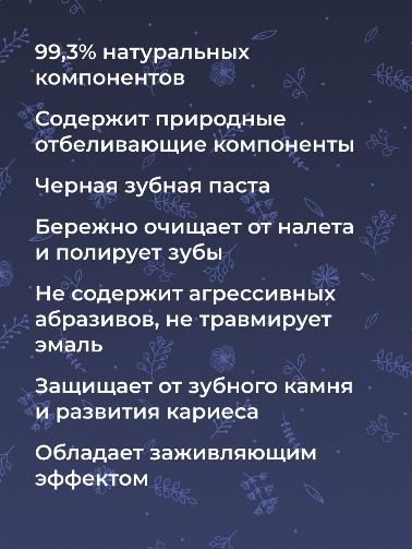 Черная зубная паста-гель Black Night с углем поглощает красящие и загрязняющие вещества с поверхности эмали, обеспечивая эффективное и бережное отбеливание. Вот он, секрет вашей ослепительной улыбки, красоты и здоровья зубов и отличного настроения!
