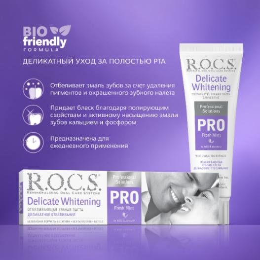 Предназначена для осветления зубов и придания им блеска, поддержания белизны улыбки, укрепления эмали и десен. Для безупречной красоты вашей улыбки и чистоты зубов. Безопасная формула: не содержит фтор, лаурилсульфат натрия, парабены и красители. Подходит для постоянного ежедневного использования. Для усиления отбеливающего эффекта рекомендуется использовать в сочетании с зубной пастой R.O.C.S. PRO Кислородное отбеливание.