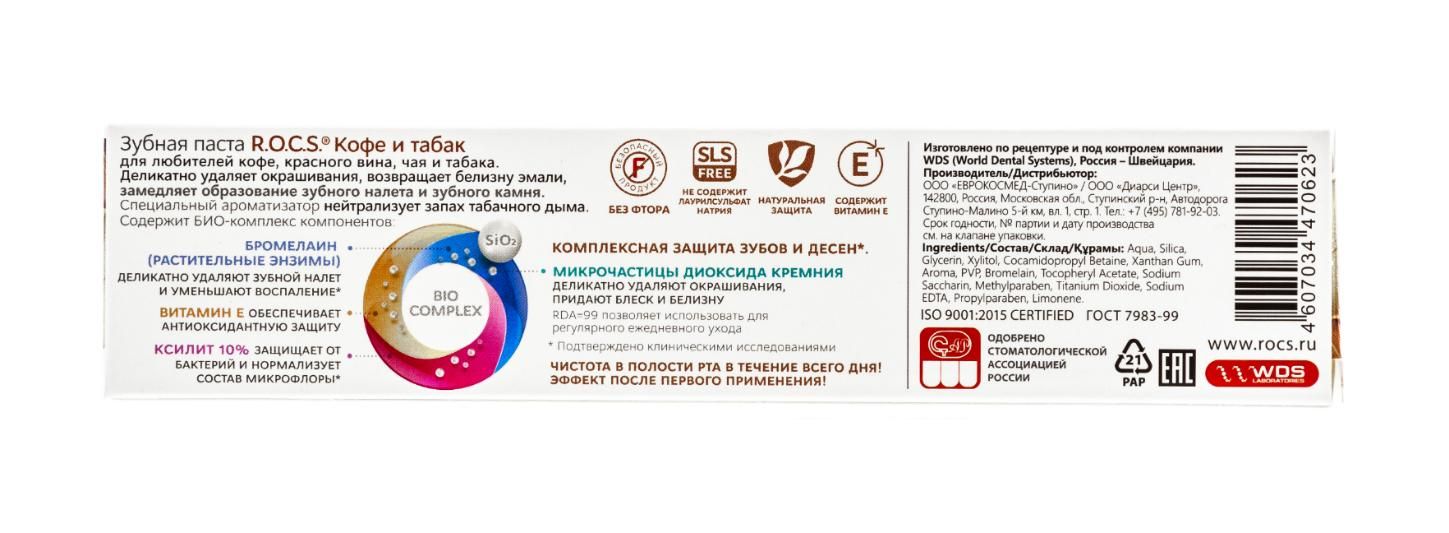 Диоксид кремния эффективно очищает поверхность зубов от пигментации никотиновыми смолами. Специальная многокомпонентная отдушка нейтрализует запах табачного дыма и надолго сохраняет свежесть дыхания. В состав пасты включены витамин Е, являющийся природным антиоксидантом, и поливинилпирролидон, обладающий способностью связывать токсины, ионы тяжелых металлов и пигменты. Умеренное содержание абразива (RDA=99) позволяет использовать зубную пасту для ежедневного ухода. Ароматическая композиция зубной пасты изготовлена на основе природных компонентов. Не содержит лаурилсульфата натрия.
