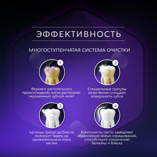 Уникальная формула зубной пасты выполнена на основе новейшей многоступенчатой очищающей системы, содержащей специальные очищающие полирующие гранулы. Благодаря особой структуре гранулы на начальном этапе чистки зубов качественно, быстро и безопасно удаляют мягкий зубной налет.