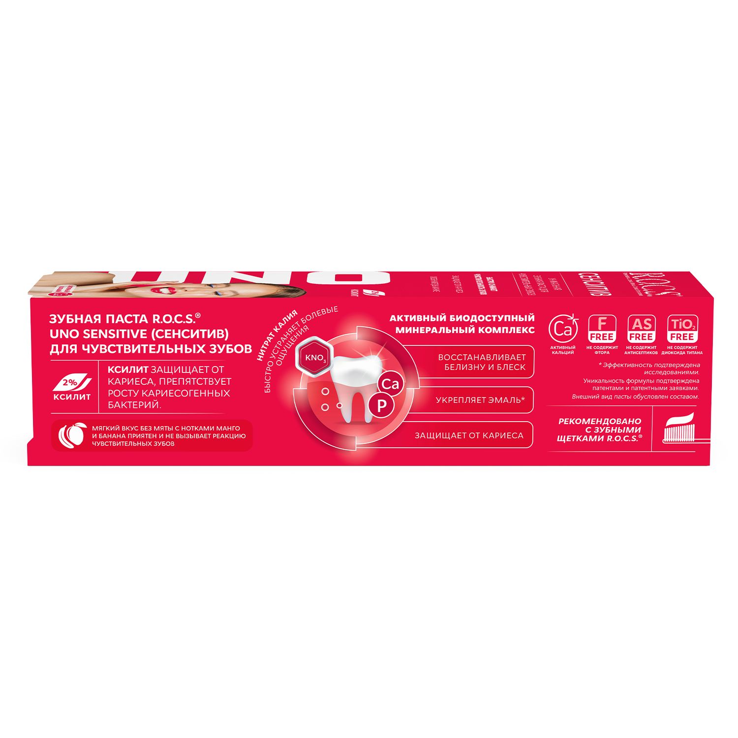 Содержит минеральный комплекс, обеспечивающий насыщение зубов кальцием и фосфором. Содержит ксилит (2,2%) - природный компонент, подавляющий активность кариесогенных бактерий, в комбинации с высокими концентрациями магния поможет успешнее бороться с зубным налетом. Нитрит Калия быстро устраняет болевые ощущения. Способность состава укреплять эмаль, насыщая ее кальцием подтверждена клиническими исследованиями. Также подходит для применения с целью восстановления эмали в постпломбировочный период и для профилактики вторичного кариеса. Не содержит фтор, антисептики, синтетические красители.