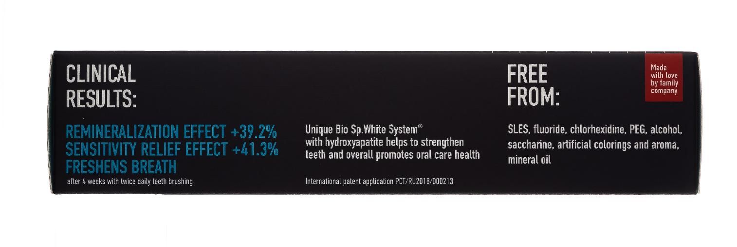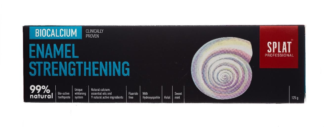 Зубная паста без фтора Splat Professional Biocalcium обеспечивает укрепление эмали. Натуральные ферменты разрушают зубной налет в самых труднодоступных местах. Паста Сплат с эфирными маслами аниса, грейпфрута, клементина, мяты и тимьяна освежают дыхание. Активный кальций и инновационная система BIO Sp.White System с гидроксиапатитом и лизатами способствуют укреплению зубов, полируют эмаль до блеска и способствуют здоровью полости рта. Высокое содержание ингредиентов в натуральной зубной пасте Сплат помогает реминерализовать зубную эмаль и добиться снижение чувствительности зубов. Зубная паста Биокальций это: Укрепление эмали; Снижение чувствительности; Бережное отбеливание и полировка зубной эмали до блеска. Зубная паста НЕ содержит SLES, парабены, химические отбеливающие компоненты, синтетические ароматизаторы, красители и компоненты животного происхождения. Серия Professional направлена на эффективный профессиональный уход за полостью рта. Экспортируется в страны Европейского союза.