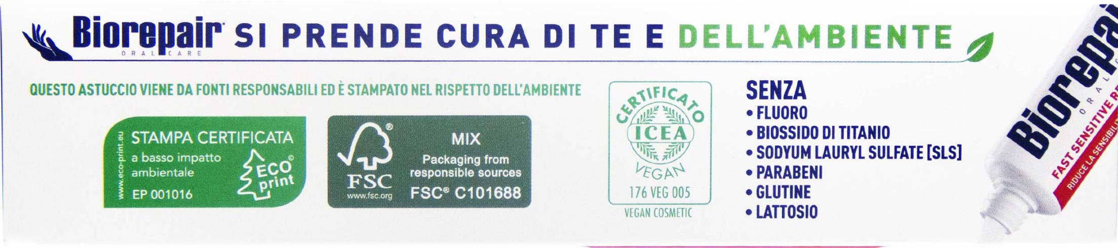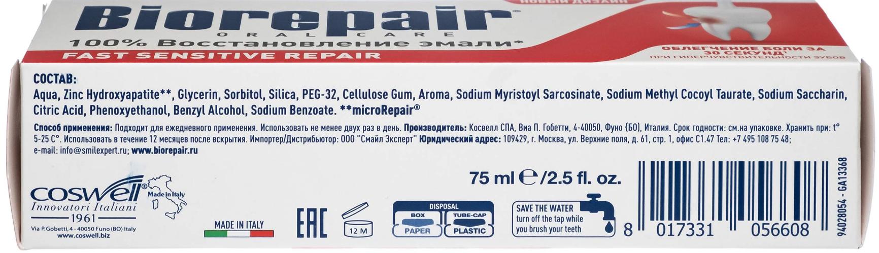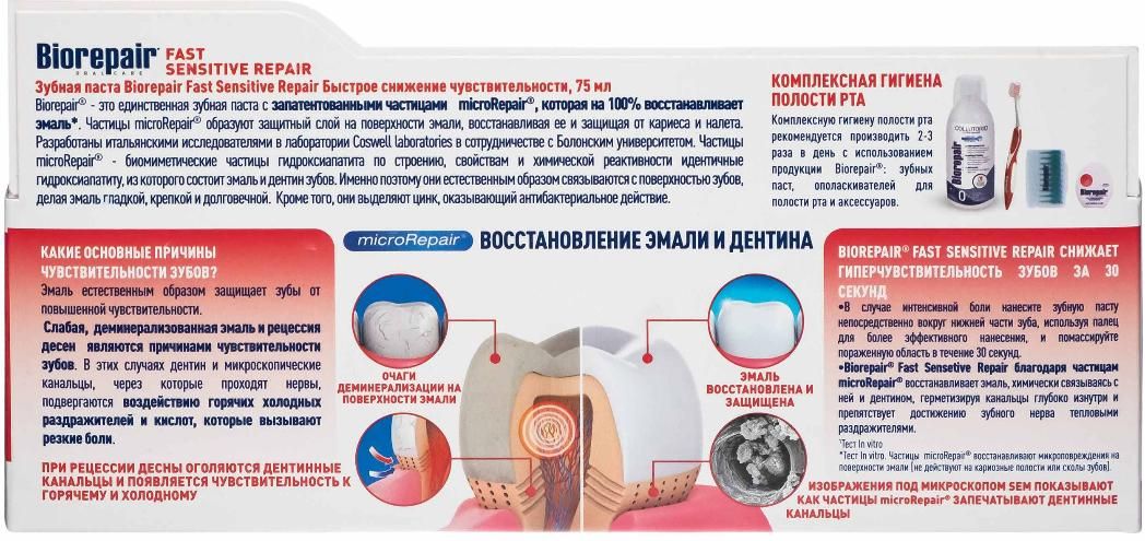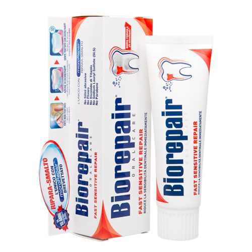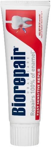 Biorepair Fast Sensitive Repair – реминерализирующая зубная паста, которая запечатывает открытые дентинные канальцы и быстро снижает чувствительность зубов. Борется с гиперчувствительностью зубов. Идеально подходит для ухода за зубами после профессиональной чистки у стоматолога, самая низкая абразивность.