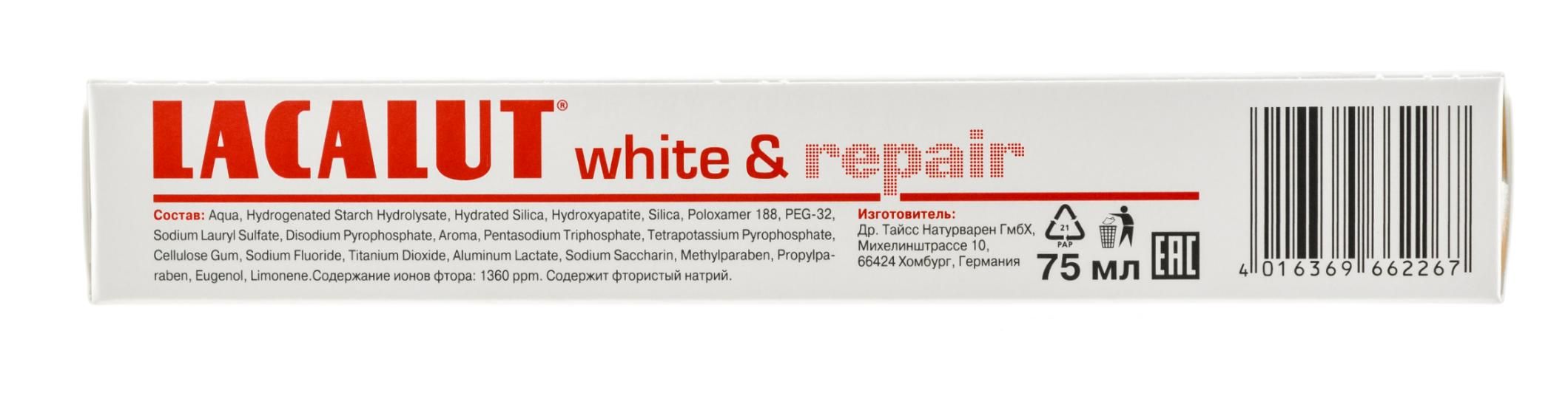 При систематическом использовании зубной пасты происходит укрепление эмали, ведь в ее состав входят аморфные корпускулы гидроксиапатита. Во время чистки эти компоненты встраиваются в поверхностный слой эмали, благодаря чему восстанавливаются ткани каждого зуба. Укрепление эмали в результате применения Lacalut White & Repair имеет достаточно стойкий эффект.