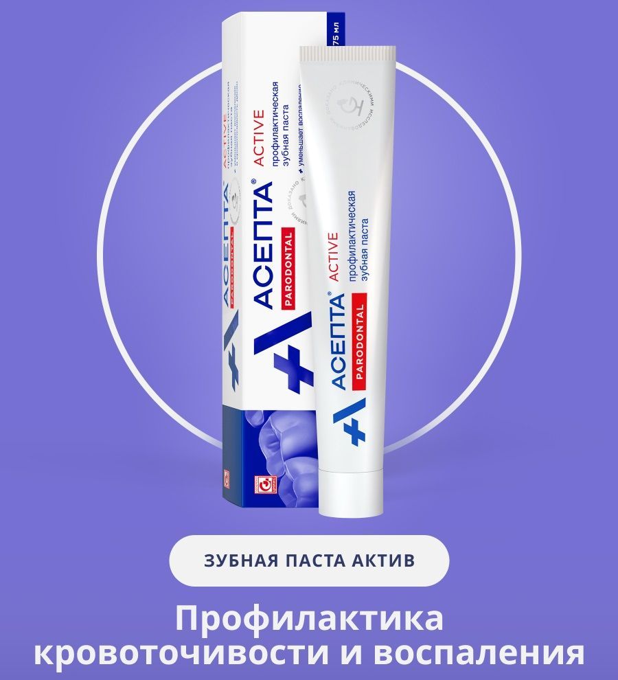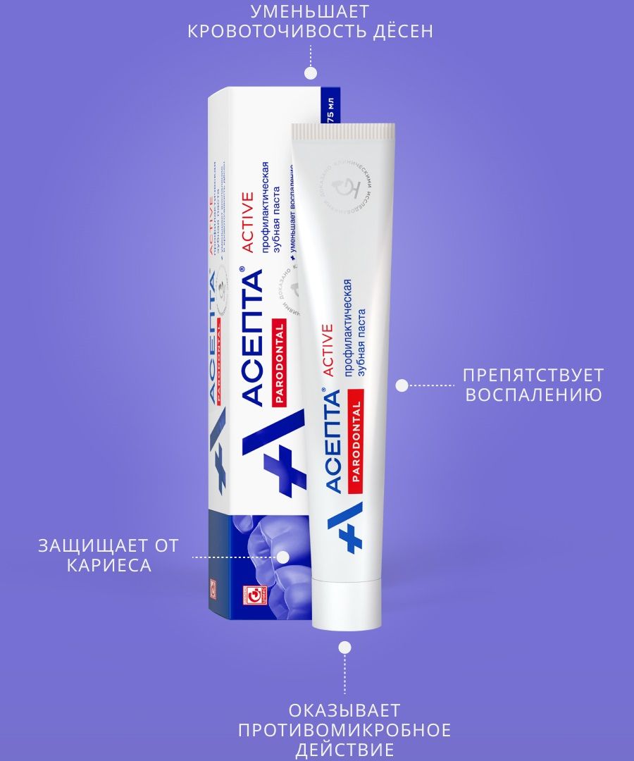 Преимуществом противовоспалительной зубной пасты АСЕПТА является уникальное сочетание лекарственных целебных трав и ферментов. Действие лечебно-профилактической зубной пасты АСЕПТА: • уничтожает опасные микробы в полости рта, • успокаивает раздраженные десны, снимает воспаления и кровоточивость, • препятствует образованию зубного налета, • обеспечивает комплексную защиту от кариеса, эффективно укрепляет зубную эмаль, • придает свежесть дыханию на целый день.
