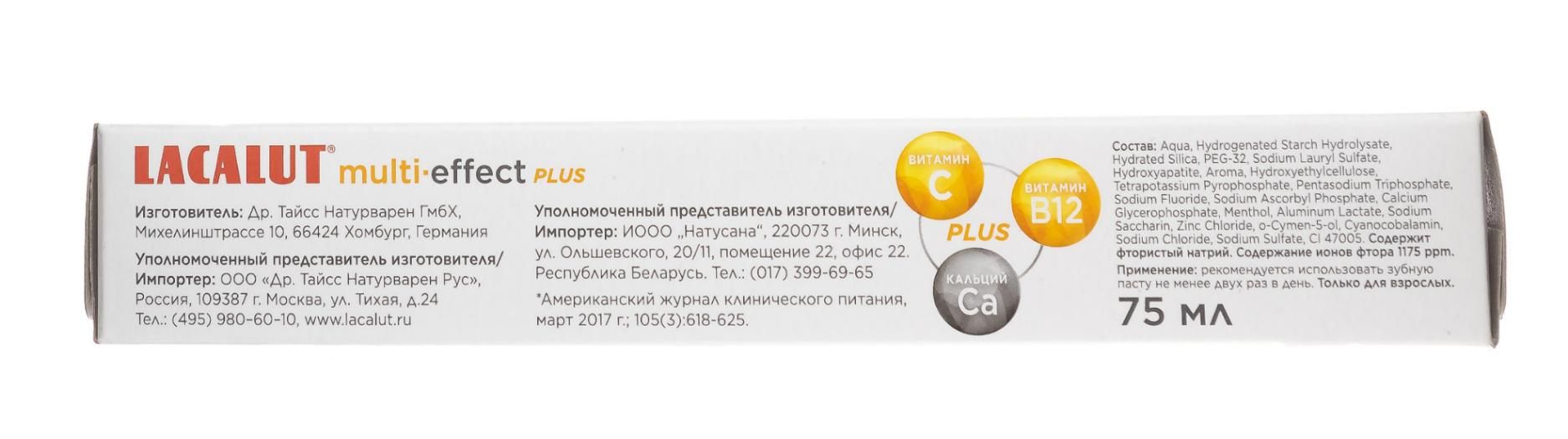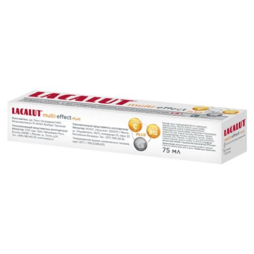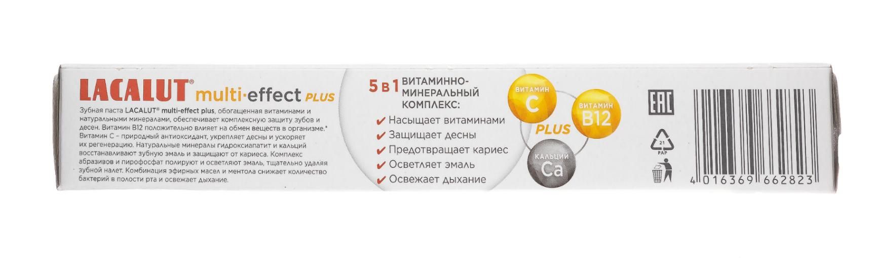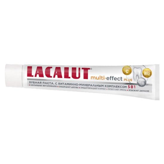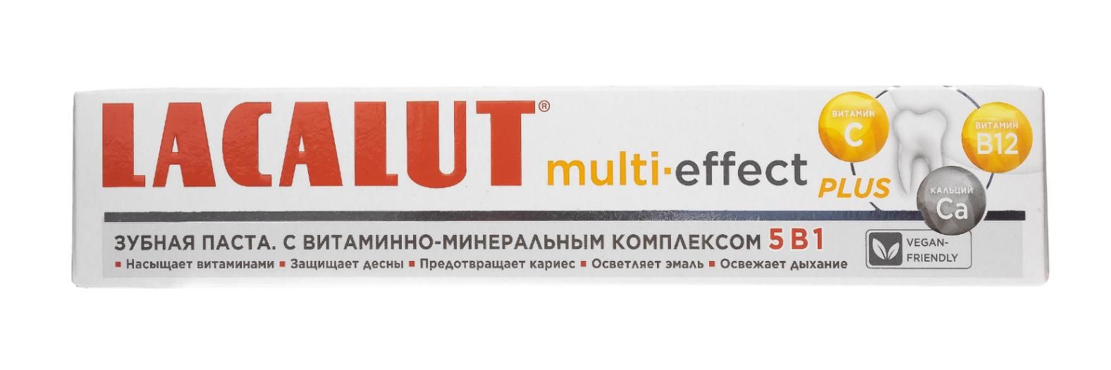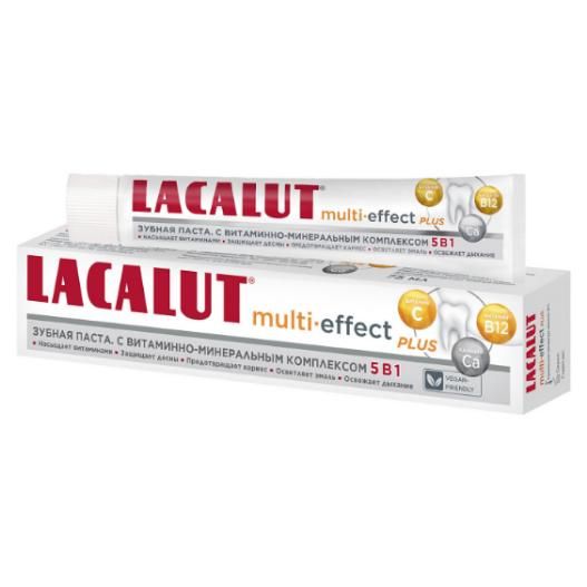 Зубная паста LACALUT® multi-effect plus, обогащенная витаминами и натуральными минералами, обеспечивает комплексную защиту зубов и десен. Витамин С – природный антиоксидант, укрепляет десны и ускоряет их регенерацию. Натуральные минералы гидроксиапатит и кальций восстанавливают зубную эмаль и защищают от кариеса. Комплекс абразивов и пирофосфат полируют и осветляют эмаль, тщательно удаляя зубной налет. Комбинация эфирных масел и ментола снижает количество бактерий в полости рта и освежает дыхание.