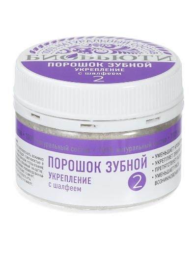 Зубной порошок № 2 «Укрепление» с шалфеем предназначен для укрепления зубов и уменьшения кровоточивости десен, он подходит для ежедневного ухода за полостью рта. Средство отлично очищает зубы, устраняет зубной налет, препятствует развитию пародонтоза, пародонтита и гингивита. Продукт размягчает зубной камень, который впоследствии удаляется зубной щеткой или зубочисткой. Зубной порошок обеззараживает, обезболивает полость рта после лечения и удаления зуба. Порошок можно использовать ежедневно всей семьей.