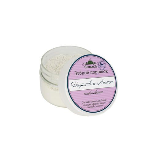Зубной порошок известен с давних времен и снова набирает популярность как натуральное средство для очистки зубов. Мягкая практически невесомая консистенция позволяет бережно очистить налет, нормализовать кислотно-щелочной баланс во рту и отполировать поверхность зубов. Карбонат кальция в составе укрепляет зубную эмаль. Каолин, благодаря своим адсорбционным свойствам, снижает риск развития кариеса, а также размягчает зубной камень, снижает кровоточивость десен и позволяет отбеливать зубы. Эфирное масло базилика обладает обеззараживающими, ранозаживляющими и тонизирующими свойствами, а эфирное масло лимона помогает отбелить поверхность зубов и помогает от кровоточивости десен.