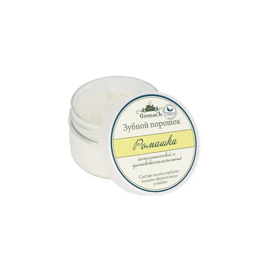 Зубной порошок известен с давних времен и снова набирает популярность как натуральное средство для очистки зубов. Мягкая практически невесомая консистенция позволяет бережно очистить налет, нормализовать кислотно-щелочной баланс во рту и отполировать поверхность зубов. Карбонат кальция в составе укрепляет зубную эмаль. Каолин, благодаря своим адсорбционным свойствам, снижает риск развития кариеса, а также размягчает зубной камень, снижает кровоточивость десен и позволяет отбеливать зубы. Эфирное масло ромашки обладает бактерицидными, противовоспалительными, болеутоляющими и ранозаживляющими свойствами.