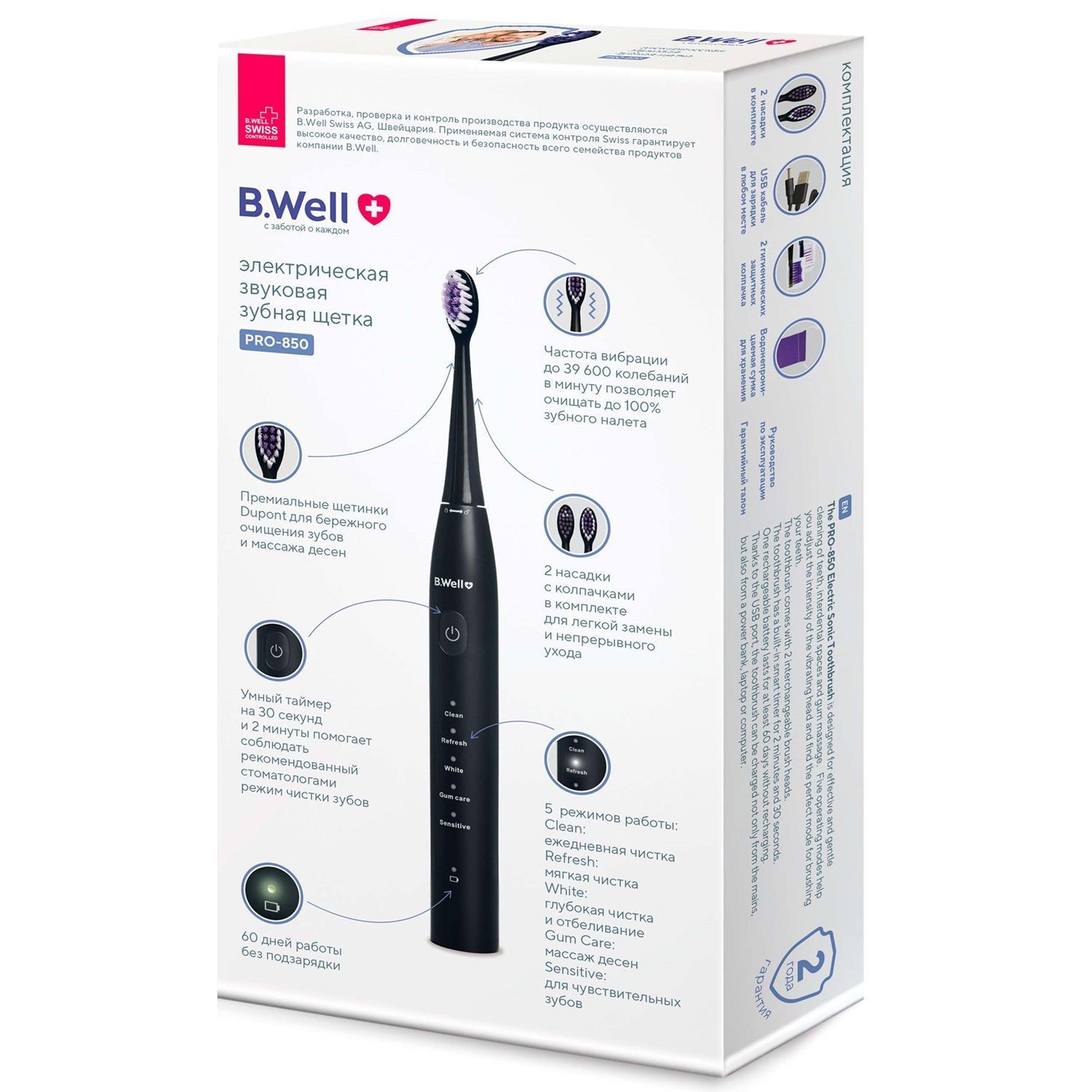 Электрическая звуковая зубная щётка B.Well PRO-850 разработана для эффективного и бережного очищения зубов, межзубных промежутков и массажа дёсен. Звуковая технология колебательных движений позволяет очищать поверхность зубов даже в самых труднодоступных местах, а высококачественные щетинки DuPont безопасны для эмали и десен. Пять режимов работы помогают настроить интенсивность колебаний головки и подобрать идеальный режим для чистки ваших зубов. Использование звуковой зубной щётки PRO-850 безопасно для пломб, мостов, имплантов, коронок и брекетов.