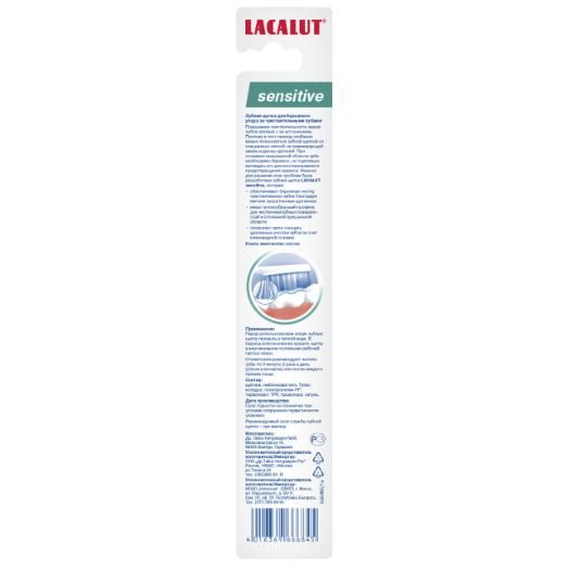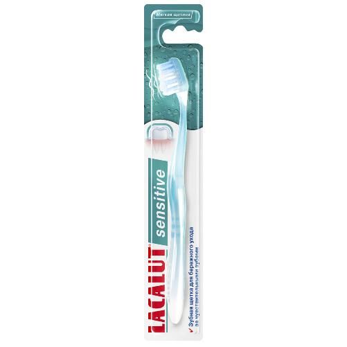 Зубная щетка LACALUT sensitive обеспечивает бережную чистку чувствительных зубов благодаря мягким закругленным щетинкам. Имеет волнообразный профиль для чистки межзубных поверхностей и оголенной пришеечной области. Позволяет легко очищать удаленные участки зубов за счет клиновидной головки.