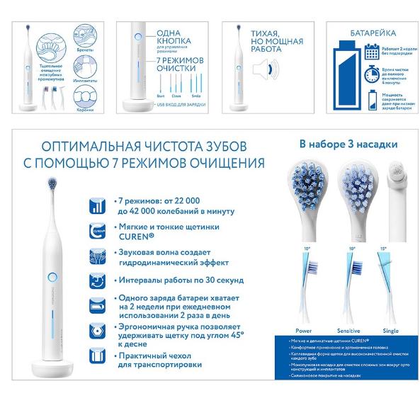 Звуковая зубная щетка Hydrosonic Pro подходит для всех членов семьи, пациентов с брекетами, имплантами и пациентов с чувствительной десной и /или эмалью зубов. Мягкие и тонкие щетинки Curen имеют решающее значение в выборе звуковой зубной щетки Hydrosonic Pro.